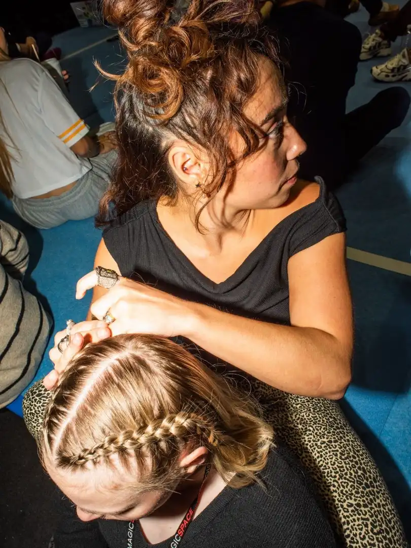 On the mats, Lee caught up with Joscelyn Roberson, 18, an alternate for Team USA in Paris and a University of Arkansas freshman. Mélanie de Jesus dos Santos, a 24-year-old French gymnast who competed at the Tokyo Games in 2021, sat with her legs pulled to her chest under an oversized striped sweatshirt as she scrolled through her phone. To her right, Katelyn Ohashi, 27, a former UCLA Bruin whose joyous floor routine at the 2019 Collegiate Challenge went viral, styled Carey’s hair, weaving small sections into braids—their longstanding pre-show ritual.